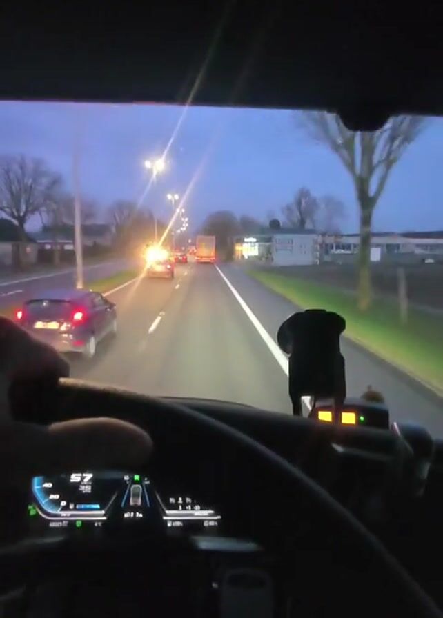 The view from a truck's cab shows an overcast, late-day scene on a two-lane road. Streetlights illuminate the road, which has a solid white dividing line. Several cars and a larger truck are visible in the distance, driving in the same direction. On the right side of the road is a small commercial building, potentially a gas station or convenience store. A small, black, possibly plush, dog figurine is visible on the dashboard. The truck's digital dashboard shows speed and other data, but the specifics are unclear. The driver's hand is lightly resting on the steering wheel.