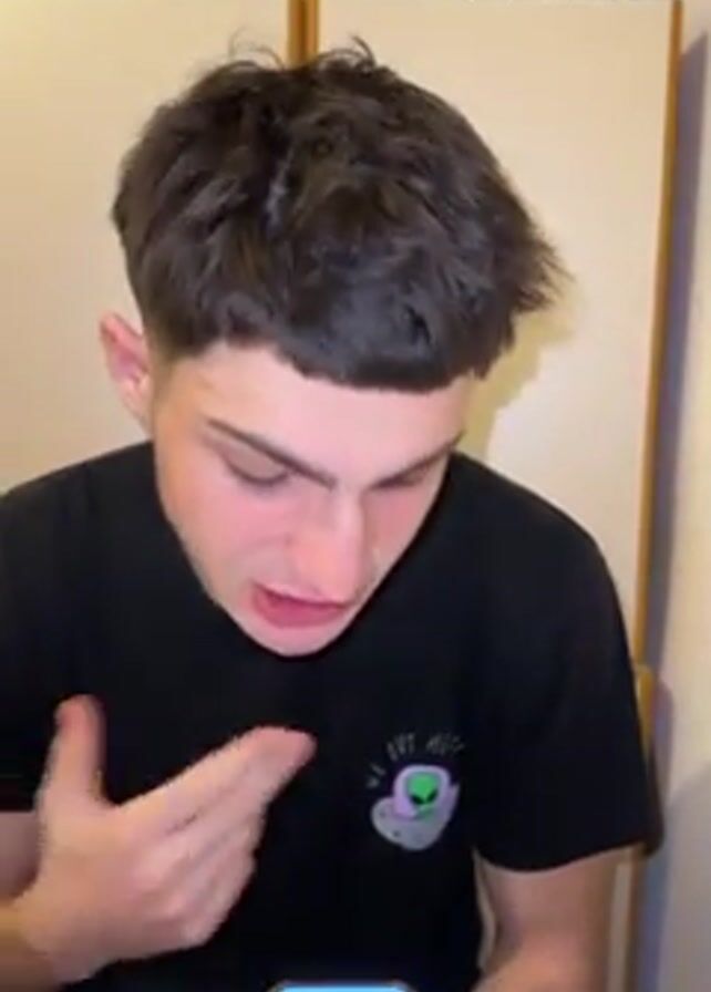 A young man is sitting at a table, intently looking at his phone. He is wearing a black t-shirt with an alien design. The table has a patterned tablecloth. Behind him is a white cabinet with items on top. The man's hair is short and dark. He seems to be reading or focused on something on the phone screen. The lighting in the room is bright.