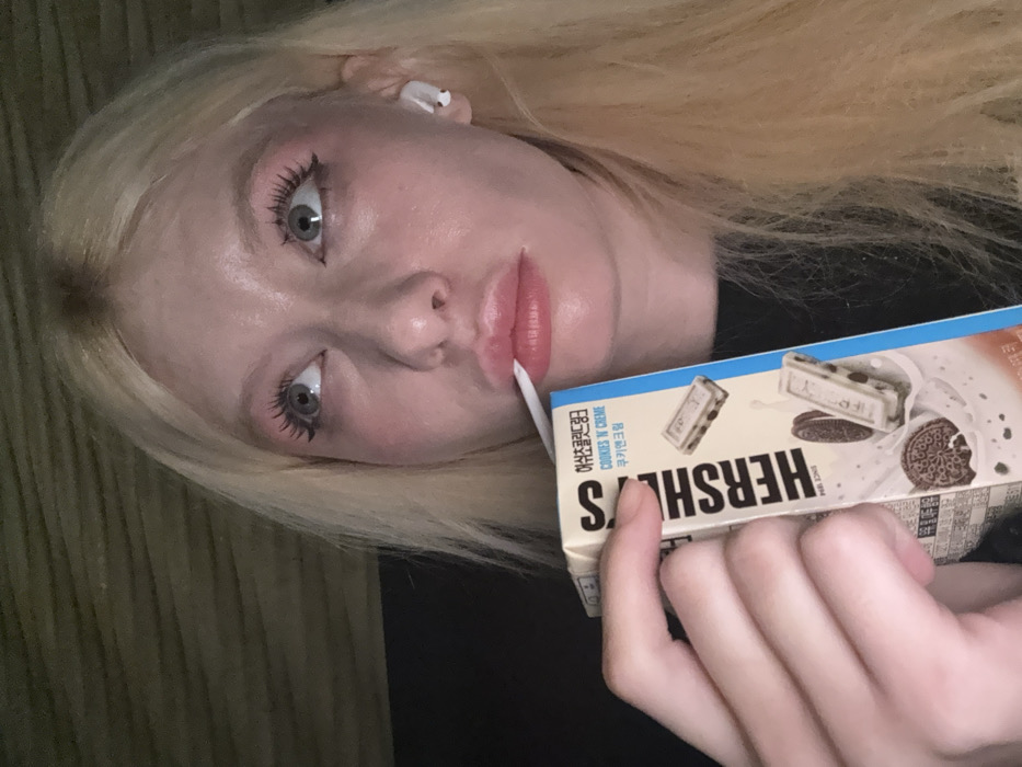 An individual with blonde hair and fair skin is depicted in a close-up, illuminated by an unseen light source, located in the city of Namyangju-si, South Korea. The person's eyes, light in color, are directed upwards and slightly to the right, framed by prominent black winged eyeliner and pinkish eyeshadow. Full lips are slightly parted, holding a white straw. A white wireless earbud is visible in the individual's right ear. The right hand holds a rectangular Hersheys Cookies 'N' Creme milk carton. The carton is predominantly white with a blue side panel, featuring the "HERSHEY'S" logo, text "COOKIES 'N' CREME" (쿠키앤크림), and illustrations of Oreo-style cookies and white chocolate bars with cookie pieces in milk. The background is uniformly dark and indistinct, with faint horizontal textures visible in the upper left quadrant. The individual appears to be drinking from the carton.