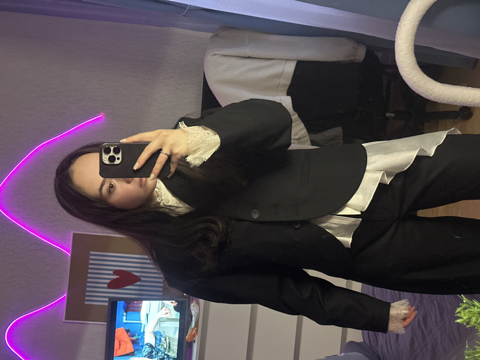 An image taken via mirror selfie depicts a young female indoors in Nekrasovskiy, Russia. The female has long, dark brown hair and is wearing a black, single-button blazer over a white ruffled blouse with lace cuffs, paired with black trousers. She holds a dark-cased smartphone in her right hand, capturing her reflection. A silver-colored ring is visible on her right ring finger. The reflected environment behind her is a room with light grey walls illuminated by a wavy pink LED strip light. To the left of the female's reflection, a white dresser is visible, topped with a television displaying colorful animated content. Adjacent to the television, a framed picture features vertical blue and white stripes with a central red heart. A dark purple bedspread and a small green potted plant are partially visible in the lower left of the reflection. To the right of the female's reflection, a black chair draped with a light-colored garment is visible, alongside a light blue curtain. A white textured, curved object occupies the lower right foreground of the reflection.