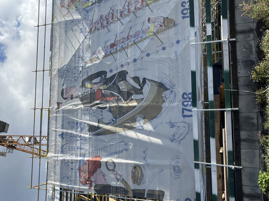 The image displays a large, rectangular artistic banner affixed to metal scaffolding in Ghent, Belgium. A yellow tower crane extends into a partly cloudy sky above the scaffold structure. The banner itself, predominantly white, features colored foreground elements and blue line-drawn backgrounds. The left panel shows a person with reddish-brown hair, clad in a dark coat, leaning to examine a circular object through a magnifying glass. A painter's palette with various colors is visible nearby. The central panel illustrates a male figure in 18th-century formal attire, including a black coat, red sash, and white stockings, standing in a brown boat amidst blue water splashes. He holds a rolled parchment. Below the boat, the blue numerals "1798" are prominently displayed, next to a sketched duck. The right panel depicts a rowing regatta, with multiple eight-person crews in white and red uniforms actively rowing shells through water. One boat includes a figure holding a megaphone. A partial red banner with "4 CLUB" and the incomplete year "193" are visible in this section. Background elements throughout the banner are line drawings of urban architecture and bridges. Below the scaffolding, a concrete retaining wall is visible. Stacked construction materials, including wooden planks and black sheeting, are present on this wall. A narrow strip of ground at the base of the wall features green foliage and small purple flowers.