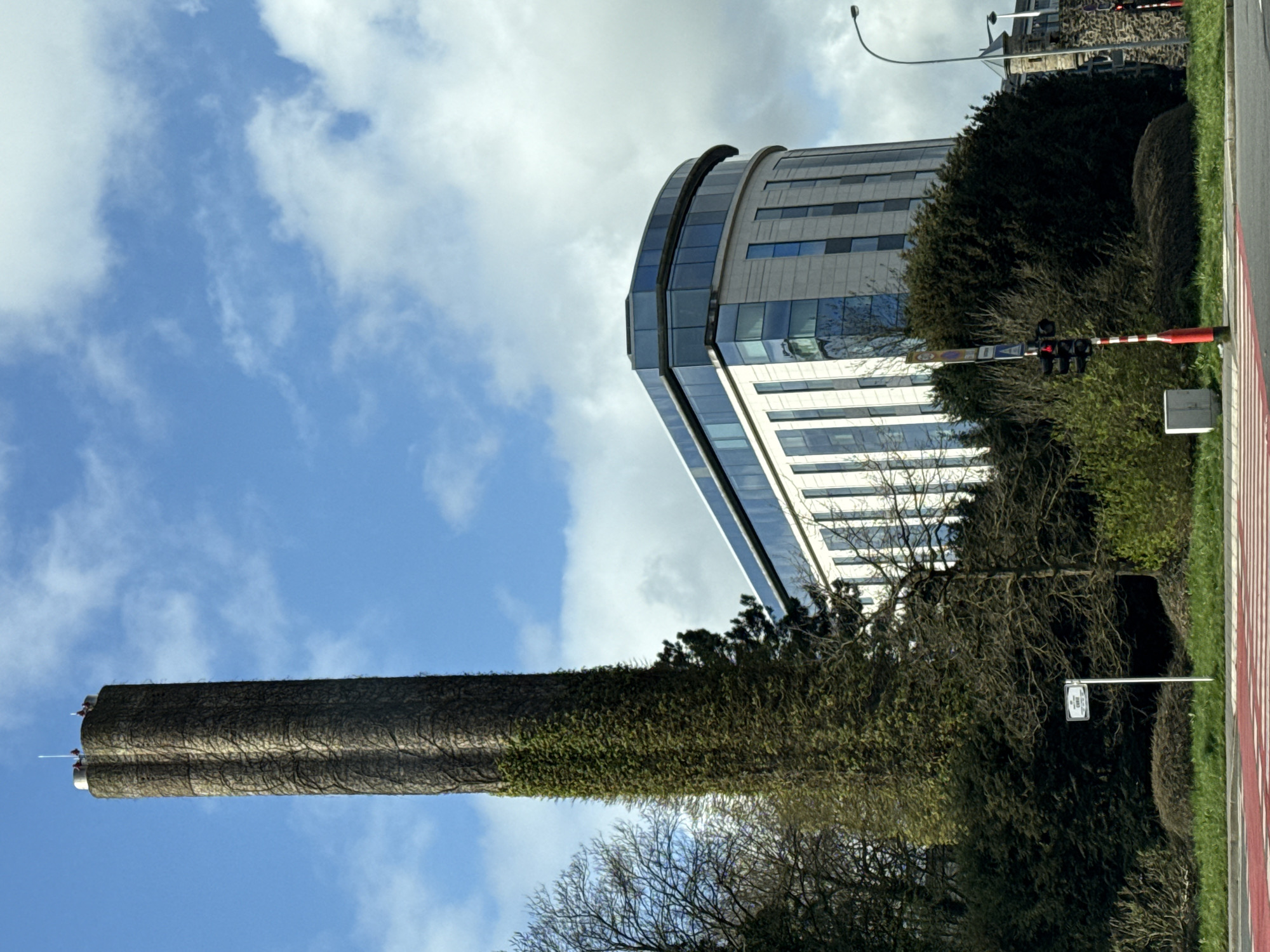 The image depicts a scene in Luxembourg City, Luxembourg, showcasing a tall, cylindrical structure covered in ivy, positioned in front of a modern, curved building with a glass facade. A traffic signal is visible near the modern building. The sky is partly cloudy, with blue patches breaking through the clouds. The landscape includes greenery, suggesting a park or roadside vegetation. A street sign is present. The image appears to have been taken from a low angle.