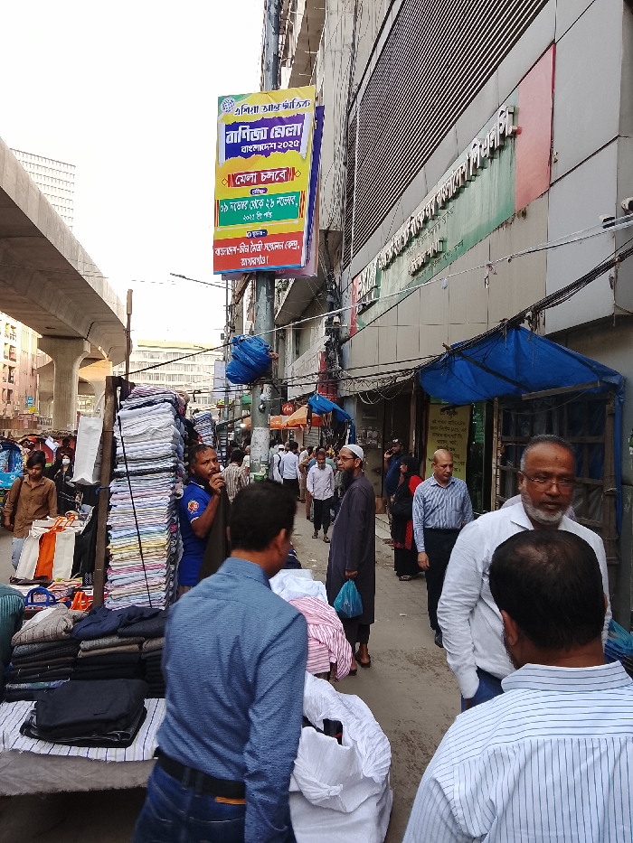 This street-level image depicts a bustling commercial thoroughfare within the city of Shibpur, Bangladesh. The scene is densely populated with approximately twenty to thirty individuals, predominantly adult males, engaged in commercial activity or transit under bright, diffused daylight. In the foreground, a man in a blue patterned long-sleeve shirt stands partially obscured, facing away from the camera, near piles of white garments. To his right, another man with a grey beard and glasses, wearing a white short-sleeve shirt, is partially visible, facing left. On the immediate left, a vendor's stall is prominently displayed, featuring tall stacks of neatly folded, multicolored shirts and trousers. Below these, additional clothing items are arranged. Several white and orange tote bags hang from a rack on the left side of this stall. A man in a blue t-shirt attends to this stall, appearing to adjust merchandise. Mid-ground individuals include a man in a dark robe and white skullcap holding a blue plastic bag, looking right, and another man in a striped shirt walking left. Blue tarpaulin awnings indicate additional vendor stalls or shops further down the street on the right. The background reveals a crowded pathway with more pedestrians. The right side of the street is bordered by a multi-story building with a textured, louvered facade and a long sign bearing green Bengali script. Above the street on the left, an elevated concrete structure, likely part of a metro line or flyover, is visible with supporting pillars. A central utility pole is burdened with numerous tangled electrical wires and supports a large, vertical banner in Bengali. This banner, advertising the "Dhaka International Trade Fair Bangladesh 2023," specifies the dates "18 Falgun to 14 Chaitra, 2022 AD" and indicates the event's location as the "Bangabandhu Bangladesh-China Friendship Exhibition Center, Agargaon." Blue bundles of plastic are secured to the utility pole and wires. The ground appears to be a worn, paved or unpaved urban surface. The overall impression is that of a vibrant, active urban marketplace.
