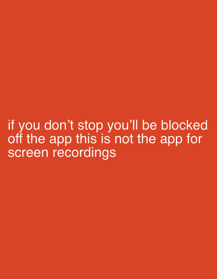 The image displays a digital message on a solid orange background, suggesting a screen capture or application interface. White, sans-serif text is centered towards the bottom-left of the frame, conveying a warning: "if you don't stop you'll be blocked off the app this is not the app for screen recordings". No people, physical objects, or environmental details are visible beyond the digital display itself. The scene depicts a direct textual communication from an application to a user, indicating a restriction on screen recording activities. This digital incident is presented in the context of Ramat HaSharon, Israel.