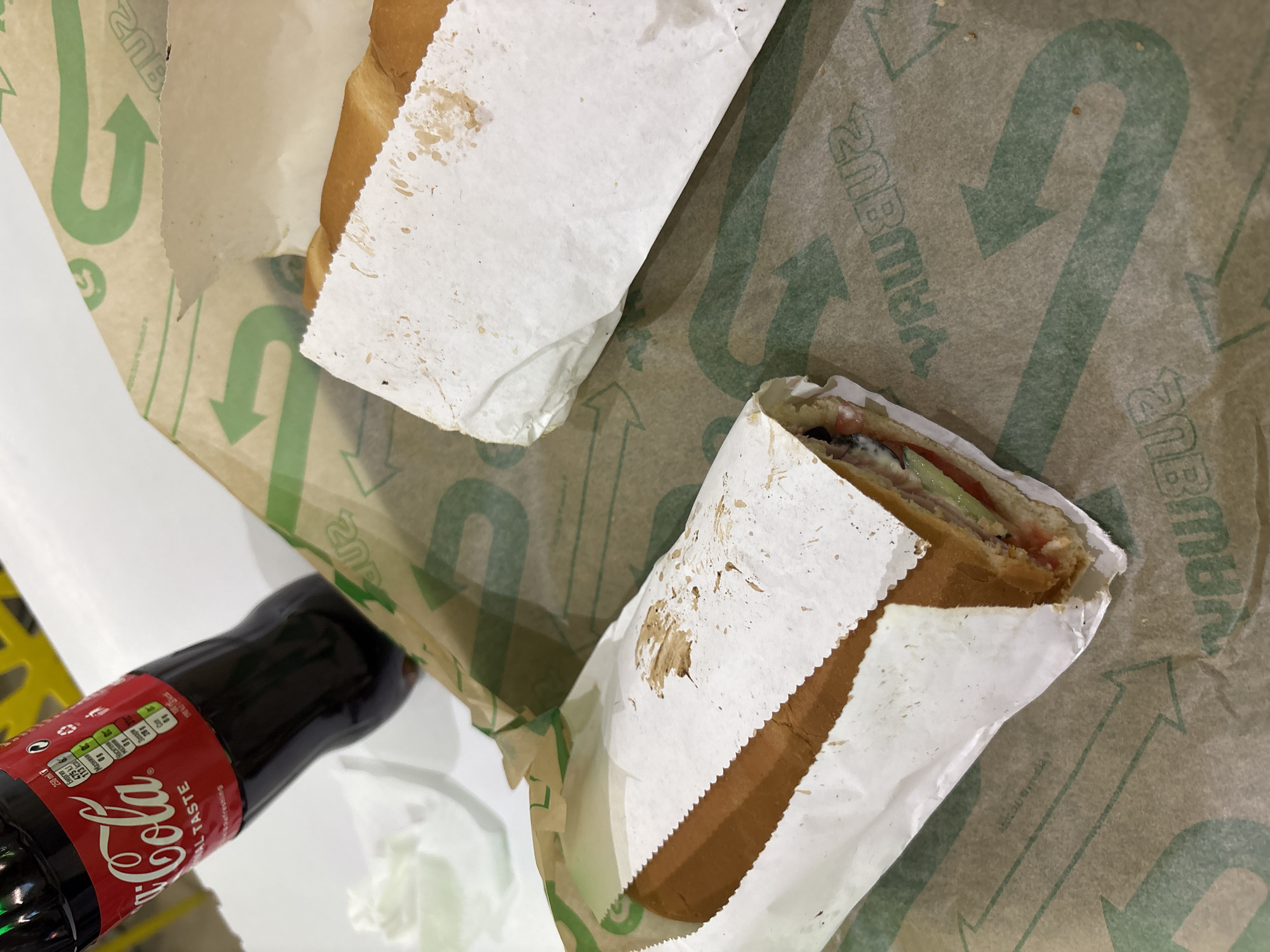 - "two Subway sandwiches in paper wrappers on a green Subway branded paper placemat" by FM-DQOXk2, licensed under CC BY 4.0