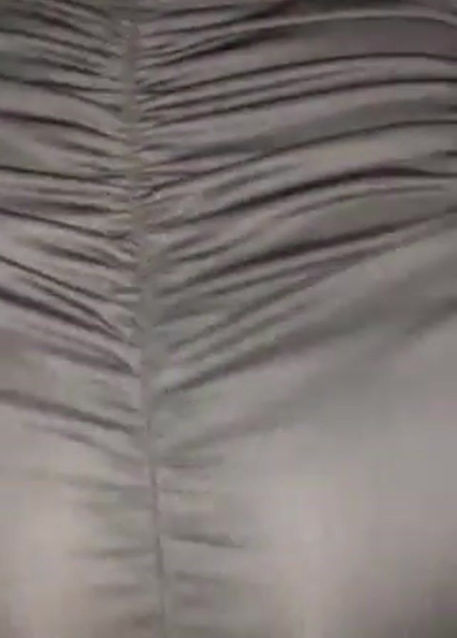 close-up of a person wearing a ruched, black dress. The focus is on the person's buttocks. A hand with long, manicured nails briefly touches the fabric of the dress.