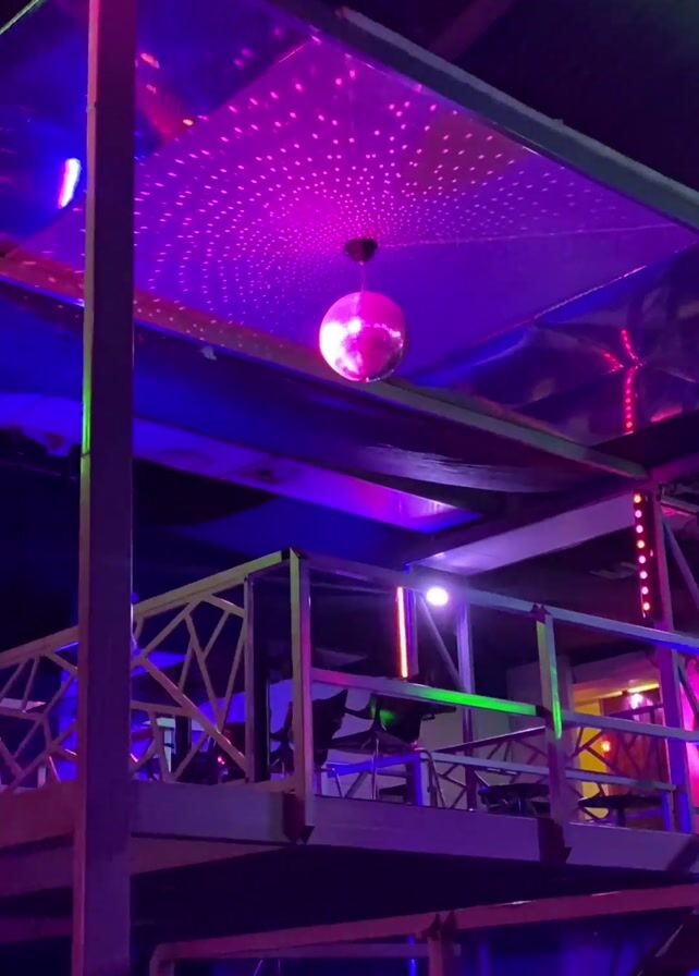 nightclub interior with a mirror ball hanging from the ceiling. The club is illuminated with pink, blue, and green lights, creating a vibrant and festive atmosphere. There is a raised platform with tables and chairs, surrounded by a metal railing. The overall environment suggests a lively and energetic nightlife setting.
