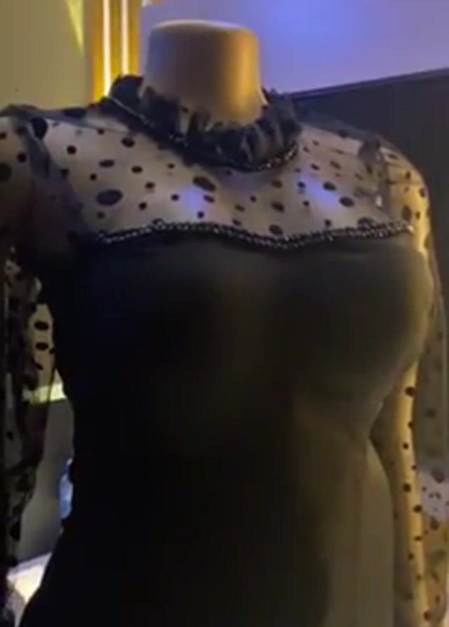A black dress on a mannequin is shown in the video. The dress has a sheer, polka-dot, long-sleeved top over a solid black bodice. The neckline features a small ruffle detail and bead embellishments. The mannequin is positioned in front of a backdrop that includes vertically arranged light strips and a dark-colored screen. A water bottle is visible on a surface to the side.