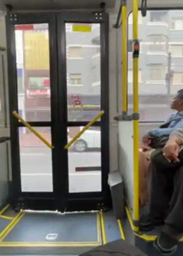 The interior of a bus is shown from the perspective of a seated passenger. The bus doors are black with yellow handles, and the exterior view shows a city street with buildings and traffic. Two passengers are visible, seated to the right of the camera, but their faces are partially obscured. The interior of the bus is clean and well-maintained, featuring yellow handrails and a gray trash bin. The lighting is bright, and the atmosphere seems calm.