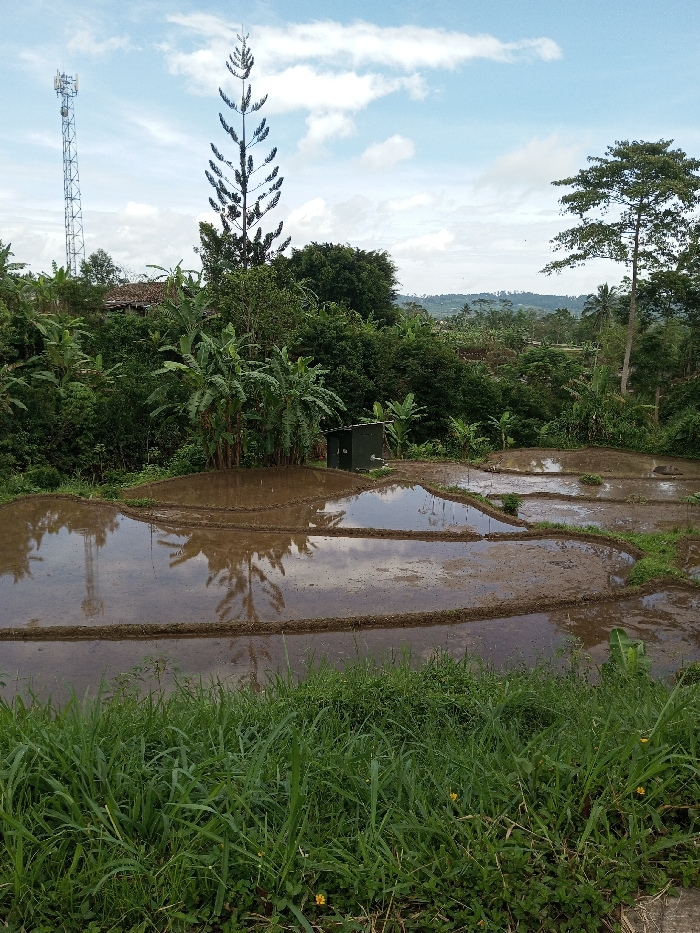 An outdoor scene in Ariyalai, Sri Lanka, displays a rural agricultural landscape under a partly cloudy sky. The foreground is dominated by dense green grass with scattered small yellow wildflowers. In the midground, several irregularly shaped, terraced rice paddies are visible, filled with muddy brown water reflecting the sky, clouds, and surrounding trees. A dark green, rectangular utility shed or small structure is situated among lush green vegetation, including multiple banana trees, at the edge of one paddy. The background reveals a continuous expanse of dense green foliage, suggesting forested areas and distant hills. On the far left, a tall, silver-colored lattice communication tower with antennae extends above the tree line. To its right, a prominent, unusually tall and slender tree with distinct, short, upward-curving branches stands against the sky. No individuals are present in the image.