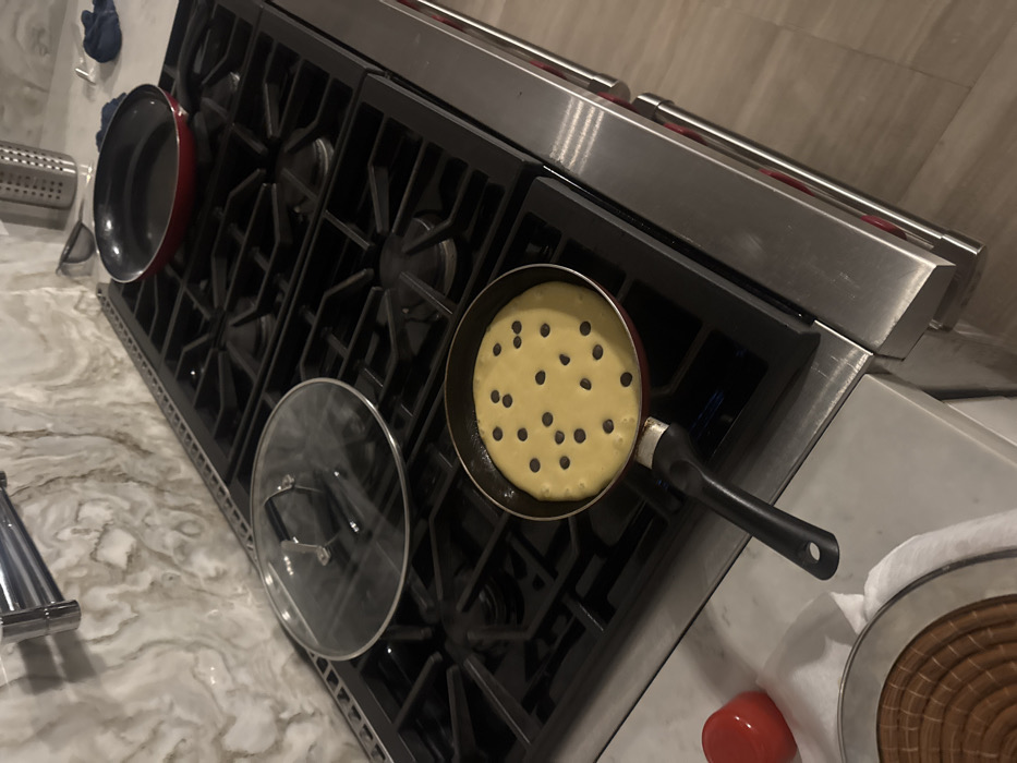 The image displays a kitchen scene in Palmetto Bay, United States, centered on a stainless steel gas range. A small, red-rimmed frying pan with a black handle rests on a front burner, containing a circular mass of light yellow batter uniformly dotted with numerous dark chocolate chips. A visible blue flame indicates the burner beneath this pan is active. To the upper left of this pan, a clear glass lid with a black knob handle lies on an inactive burner. A larger, empty red-rimmed frying pan occupies a rear burner. The gas range features six black grates covering the burners and a stainless steel front panel. A light-colored marbled stone backsplash extends upwards behind the range, partially showing a stainless steel pot filler faucet above. To the immediate left of the stove, on a white countertop, a red plastic container or cap is present, along with a partially visible circular woven mat beneath a clear, shallow dish. A section of a stainless steel oven door with two horizontal handles is visible in the lower right foreground, beside light-toned floor tiles.