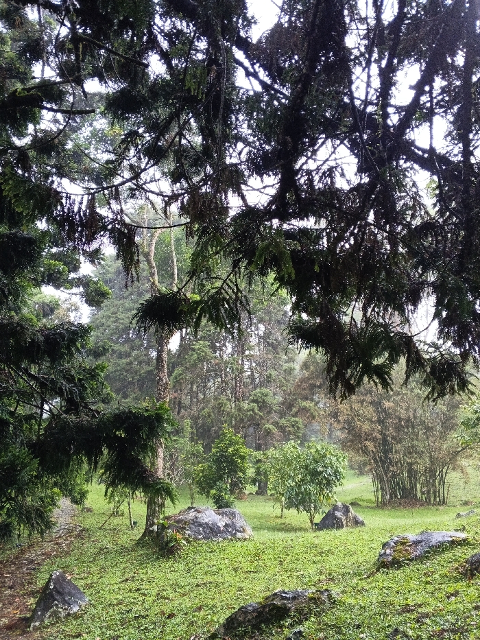 Lush greenery dominates the scene, featuring a grassy field dotted with mossy rocks. A variety of trees, including evergreens, rise beyond, some obscured by mist or fog. Overhanging branches with thick, dark foliage frame the upper portion of the view. The overall impression is one of tranquility and natural beauty.