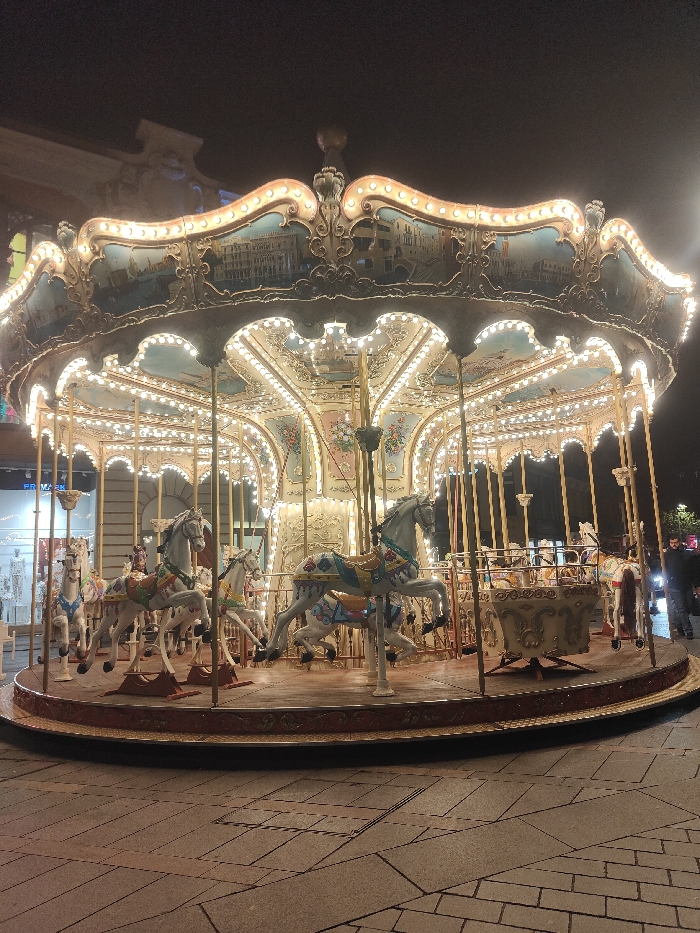 - "A brightly lit, ornate carousel stands prominently at night" by FM-5lleo2, licensed under CC BY 4.0