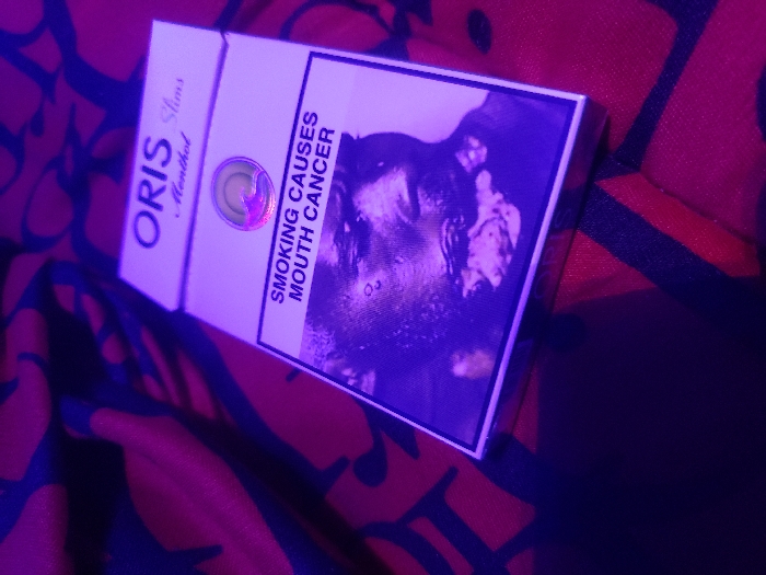 - "A white pack of "ORIS Slims Menthol" cigarettes rests on a red and dark blue patterned fabric in Okpanam, Nigeria" by FM-vXzHq2, licensed under CC BY 4.0