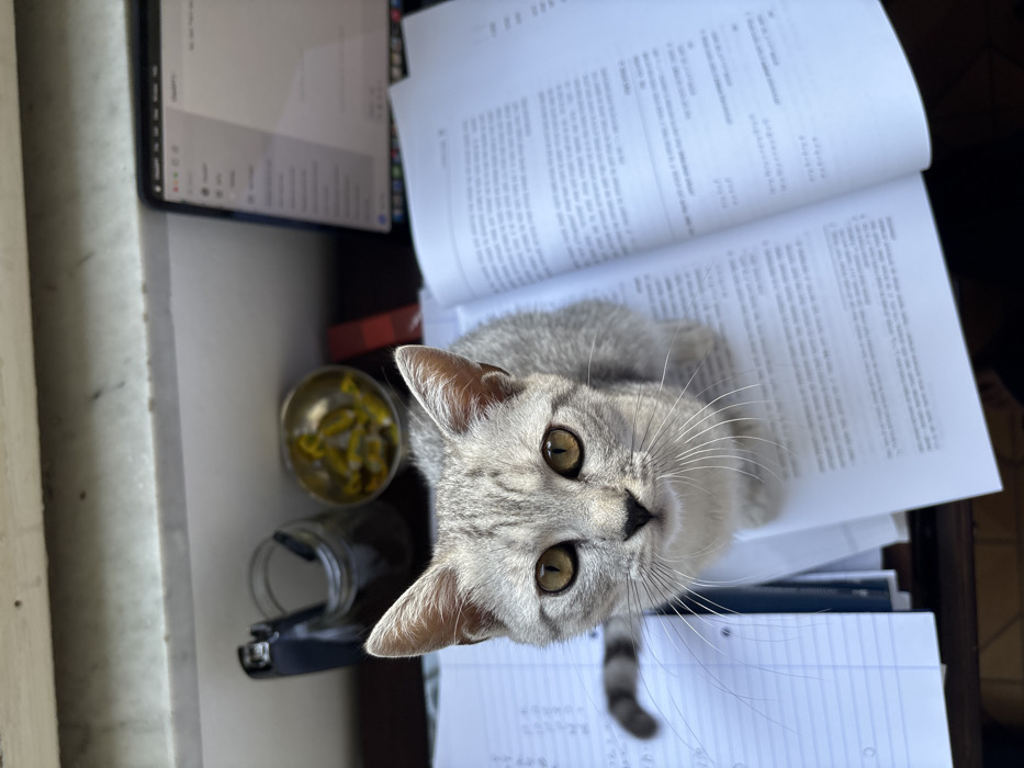- "A high-angle, indoor photograph captures a silver tabby cat seated on an open textbook on a desk in a room in Tel Aviv, Israel" by FM-sCiCt2, licensed under CC BY 4.0