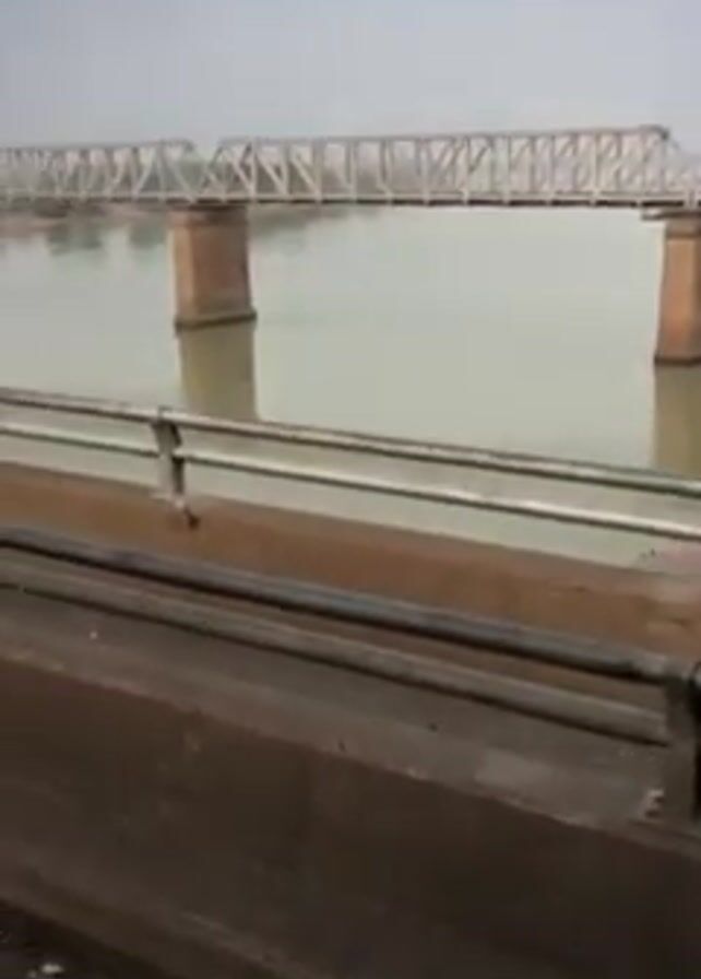 The video depicts a view from a bridge, looking out at another, similar bridge spanning a wide river. The water is a murky, light brown color. Heavy fog or mist obscures the background. The perspective is from a moving vehicle, as indicated by the blurred foreground of the bridge railing. The second bridge is a steel truss structure with supporting piers in the river. The sky is uniformly overcast. The overall scene is gray and muted due to the weather conditions.