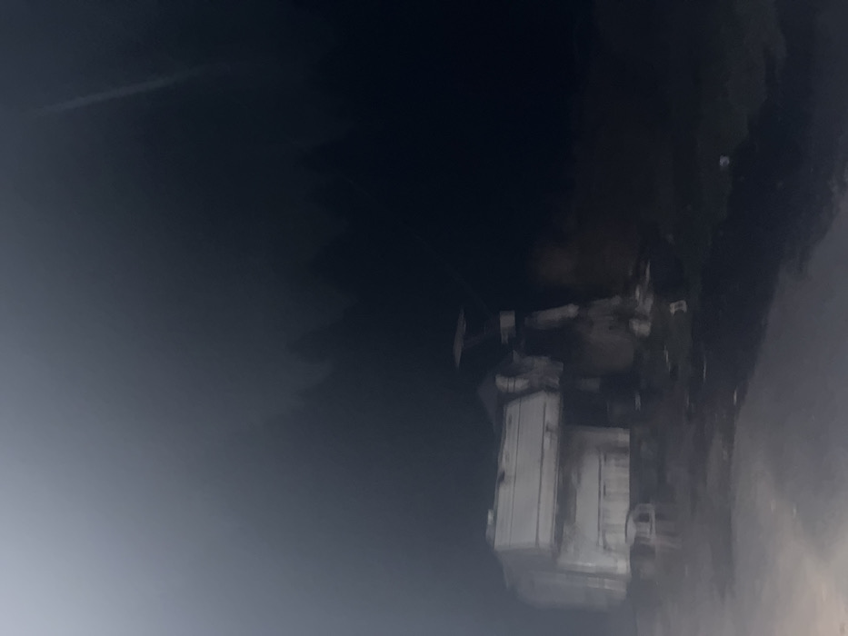 A partially obscured, unclear image appears to depict a building or structure at night. The building is white with doors visible. The right side of the image is dark, suggesting trees or shadows. The left side is gray and blurry, obscuring the view. A contrail is visible in the top-left corner.