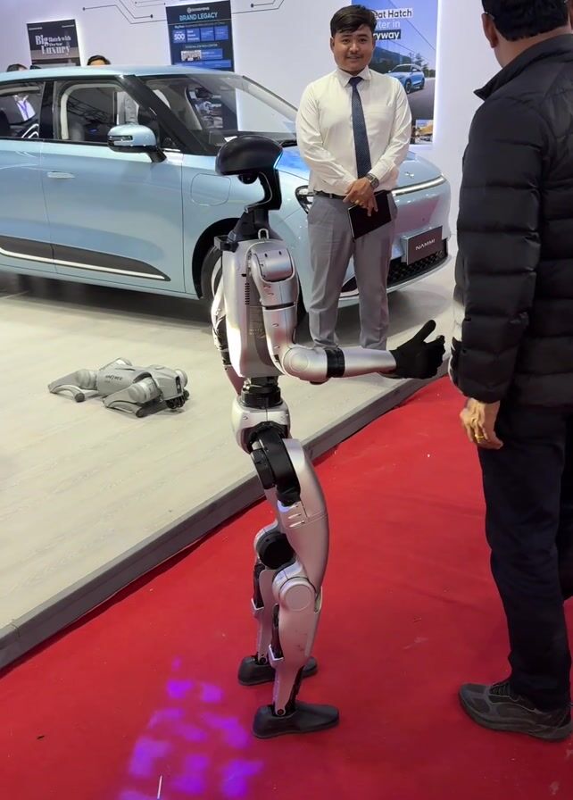 human-shaped robot shaking hands with people at what appears to be a trade show or exhibit. The robot is silver and black and stands on a red platform. Behind the robot is a light blue electric car. A man in a white shirt and tie stands near the car. People walk by and interact with the robot, including one man who shakes its hand. Another smaller, similar-looking robot sits inert on the platform near the legs of the standing robot. The background includes informational posters about the car brand.