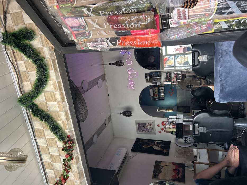 This image depicts the interior of a hair salon or barbershop located in Alaiyabiagba, Nigeria