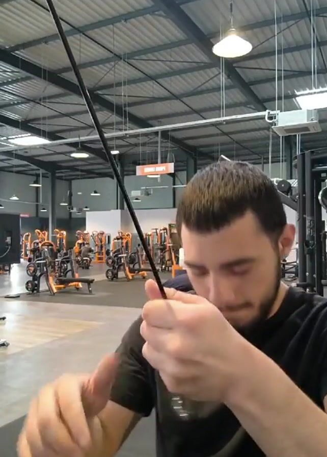 A young man with dark hair and a beard stands in a gym. He is wearing a black t-shirt and holding a cable from a pulley machine. He looks at the camera, rubs his nose, and then turns his head to the side. The gym is relatively empty with various weight machines visible in the background, most of them orange. The gym has a high ceiling with metal beams and lighting fixtures.