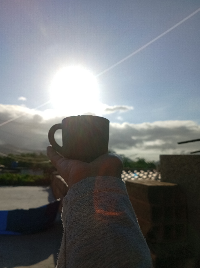 The scene is an outdoor, elevated view, likely from a rooftop, within the city of Altagracia, Venezuela. A human hand, covered by a light grey sleeve, is centrally positioned, holding a dark, opaque mug with a handle. The mug and hand are silhouetted against a brilliant, overexposed sun located in the upper-left quadrant of the sky. The sky is light blue with scattered white and grey clouds, and a distinct white contrail extends diagonally from the upper right towards the sun. A warm, reddish lens flare is visible on the sleeve. In the mid-ground and background, an urban landscape unfolds, featuring light-colored roof tiles, a rectangular grey structure, and a partially visible blue and dark fabric object on the immediate rooftop. Beyond, blurred green foliage, distant structures, and subtle hill formations are discernible. The strong backlighting from the sun casts the foreground into deep shadow, indicative of early morning or late afternoon.