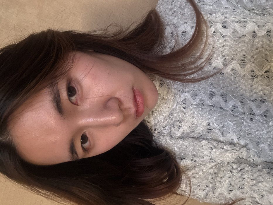 A young Asian woman with long brown hair and fair skin gazes at the viewer. She's wearing a white, lacy top. Her expression is neutral, and the focus is primarily on her face. The image is slightly tilted, creating a casual, informal feel. The lighting is soft and even, highlighting her features. The background is muted and does not distract from the subject.