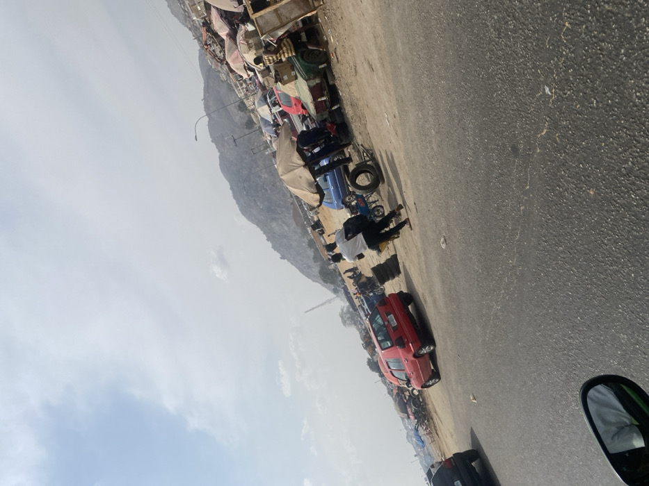 The image captures a wide-angle view of a roadside market scene in Zuba, Nigeria, under a bright, hazy sky. In the immediate foreground, the dark asphalt surface of a paved road occupies the lower portion of the frame. A black vehicle's rear bumper and side are partially visible on the far left, suggesting the vantage point is from within or beside another vehicle, whose green rearview mirror is prominently seen in the bottom left corner. To the left of the road, on a dirt shoulder, a red Volkswagen Golf hatchback (likely a Mk3) is parked facing away from the camera. Further right, closer to the center, two individuals are walking away, both wearing white shirts and dark pants. The person on the left carries a black backpack. The person on the right is pushing a small, light-colored cart with a blue object on it. Adjacent to them, several black tires are stacked on the dusty ground. The midground is dominated by a bustling, open-air market established on a dirt terrain beside the road. Numerous makeshift stalls are visible, characterized by various light-colored umbrellas or tarpaulins providing shade. People are present throughout this area, some engaged with the stalls. One individual in a striped shirt stands next to a wooden crate near the right edge. Various vehicles, including a blue car and a green utility trailer, are interspersed among the stalls. The ground is unpaved, dusty, and appears cluttered with goods and debris. In the background, a prominent, rugged, rocky mountain rises under a pale blue sky with scattered thin clouds, indicative of a dry environment. A light atmospheric haze partially obscures the distant view. Buildings and structures are faintly visible between the market area and the base of the mountain.