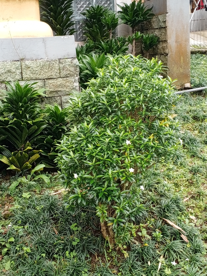A lush garden scene features a small tree with dense green foliage dotted with tiny white flowers. It's surrounded by various plants, including bromeliads and grass-like ground cover. A stone wall and other taller greenery frame the scene, suggesting a well-maintained landscape. The lighting is soft and natural.