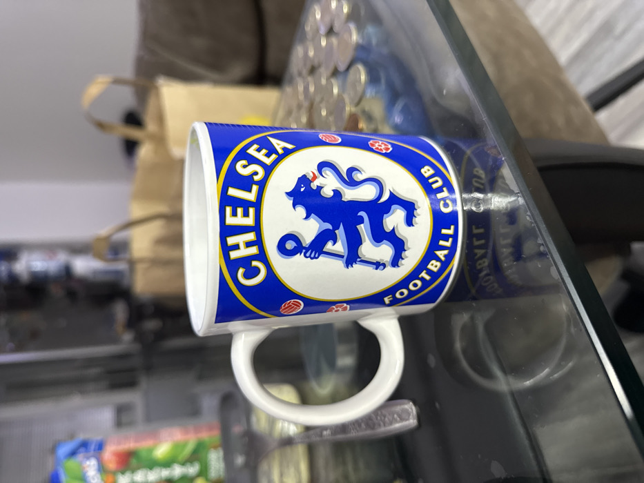 The image displays an indoor scene featuring a white ceramic mug as the central subject, positioned on a clear glass table. The mug is adorned with the Chelsea Football Club logo, which includes a blue heraldic lion rampant holding a staff, encircled by the words "CHELSEA" at the top and "FOOTBALL CLUB" at the bottom in yellow text on a blue band. Small red football motifs are visible on the inner white circle of the logo. A white handle extends from the left side of the mug. The glass table surface reflects the lower portion of the mug and its inscription. To the immediate left of the mug, a silver-colored utensil, possibly a spoon, is partially visible. Further left, in the blurred background, a blue and green package, potentially a juice box, exhibits illegible text that appears to be in an Asian script. To the right of the mug, a collection of assorted coins, varying in color from silver to copper, are scattered on the glass table. In the out-of-focus background, two brown paper bags with handles are discernible, resting on what appears to be a light brown upholstered furniture item, possibly a couch. No individuals are present, and no actions or interactions are depicted. The environment suggests a domestic setting, such as a living room or common area. The specific location within the city of Sofia, Bulgaria, cannot be determined from the provided visual information.