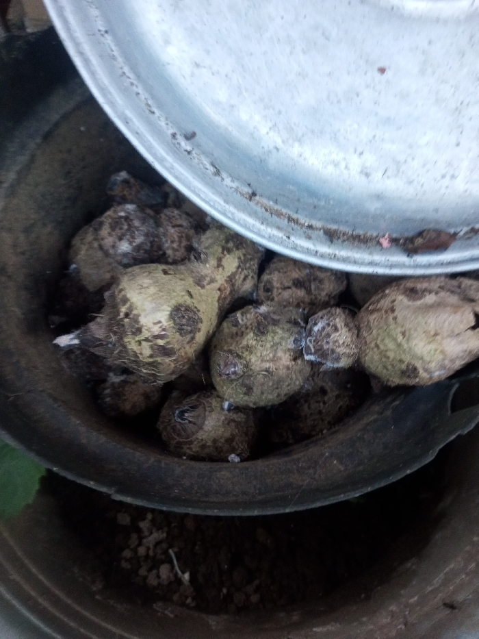 - "The image displays a close-up, top-down view of approximately 15-20 unpeeled tuberous vegetables, likely taro or similar, within a dark brown or black bucket-like container in Ciherang, Indonesia" by FM-ltSLb2, licensed under CC BY 4.0
