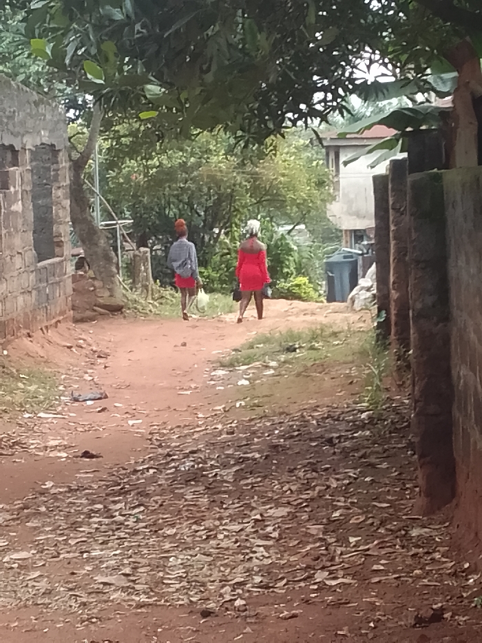The image depicts an unpaved, reddish-brown dirt pathway in the city of Unknown, Unknown, viewed from a low angle. The path, covered with scattered dried leaves and debris in the foreground, extends into the background, flanked by vegetation and structures. Two individuals, appearing to be adult females, walk away from the viewer along the path. The person on the left wears a light-colored long-sleeved top over a red bottom and carries a light-colored bag in her left hand. Her hair is styled in an upward bun. The person on the right wears a red short dress and has light-colored hair pulled back; she carries a dark bag in her left hand. To the left of the path, a partially constructed or dilapidated brick building with visible window openings is present, behind which dense green foliage and a tree trunk are visible. Along the right side of the foreground, a series of dark, square, vertical pillars or sections of a wall run parallel to the path. In the background, beyond the walking individuals, additional green trees and shrubs are seen, along with distant buildings, including a light-colored structure with a reddish roof and a large dark container (possibly a water tank or bin) to its left. The sky is not visible, and the scene is illuminated by ambient daylight.