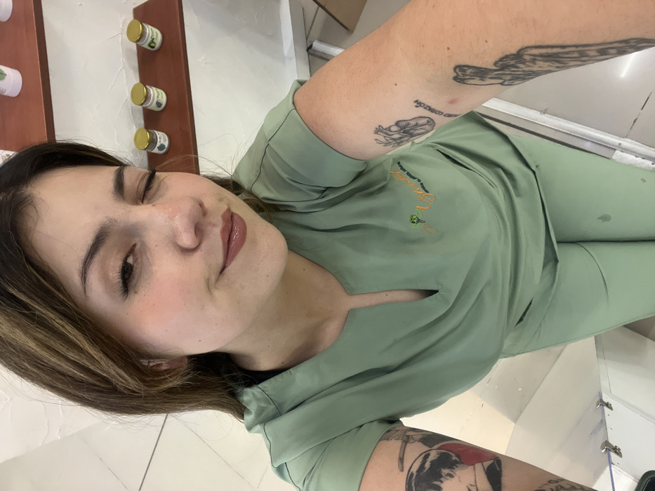 A woman with shoulder-length brown hair and light skin poses for a selfie, winking her left eye. She's wearing a light green uniform with a logo and has tattoos on both forearms. The background includes a shelf with small jars and a reflective floor. The image is rotated, making the woman appear sideways.