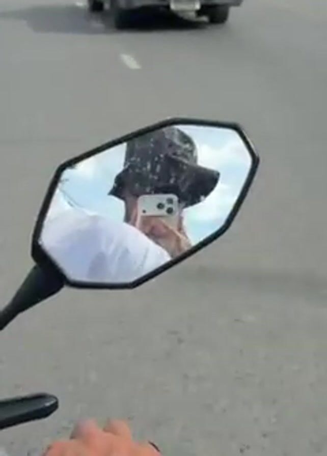 A first-person perspective from a motorcycle traveling on a road, the rider wearing a white shirt and holding the handlebar. In the side mirror, a person wearing a dark patterned hat and sunglasses takes a selfie with a white phone. Cars and trucks are visible on the road. The sky is cloudy with patches of blue. The motorcycle is moving beside a white van.