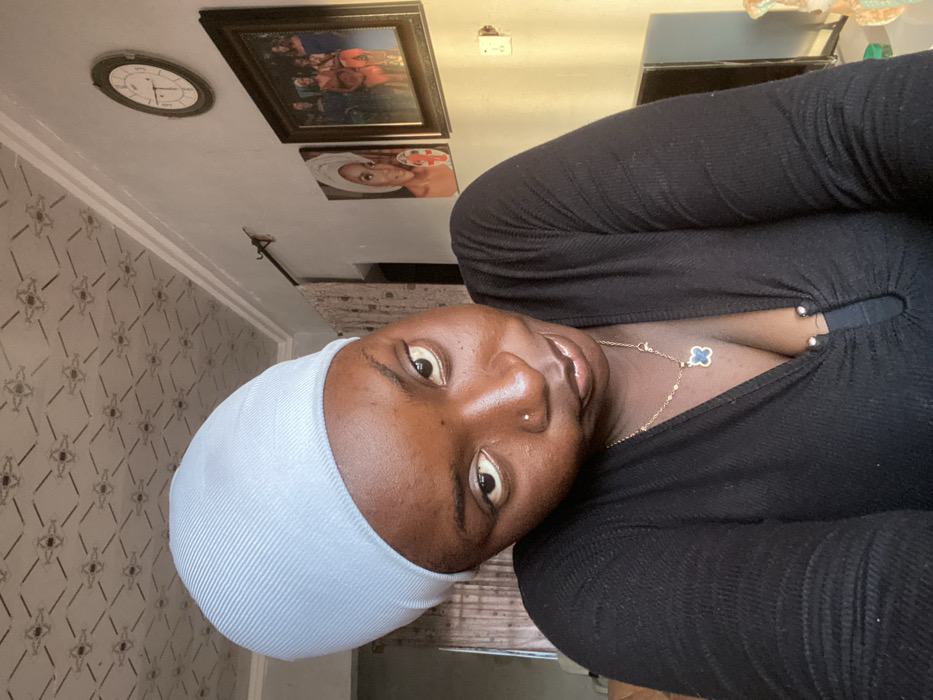 An individual with dark complexion is centered, looking directly at the camera with a slight head tilt