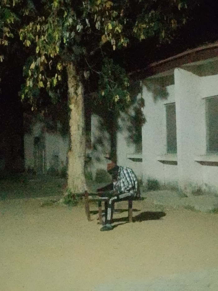 A man sits on a wooden bench at night. He wears a plaid shirt, dark pants with stripes, and a hat. He appears to be writing on a surface in front of him. A tree with leaves is behind him to the left. A white building with windows is behind him to the right. The ground is a light color. The scene is dimly lit.
