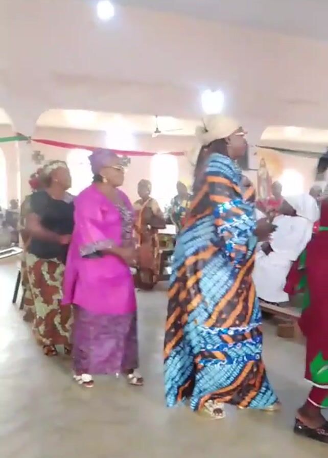 group of women dancing in a line inside a large, bright room. The women are wearing colorful, patterned clothing, including head wraps and dresses or skirt and top combinations. They appear to be moving to music, their arms swaying and stepping in unison. Other people are seated in the background, some clapping along to the music. The room has light-colored walls and a high ceiling, with decorations strung across the top of the room. There are also religious statues visible in the background. The floor appears to be a polished concrete or tile. A ceiling fan is also visible.