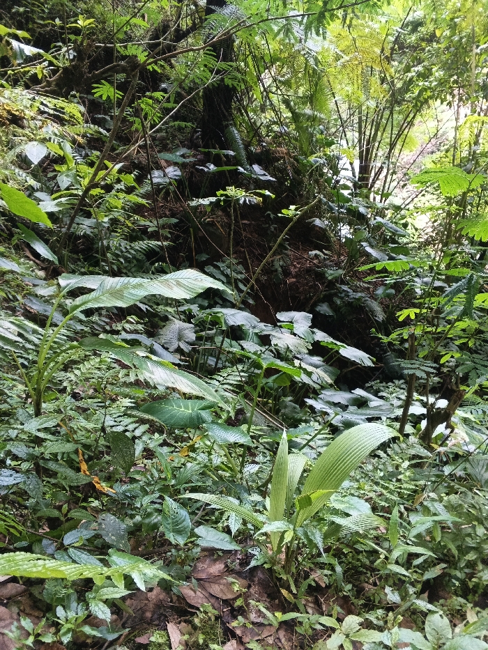 Lush green vegetation densely populates the scene, creating an immersive jungle environment. Various plant species, including ferns, leafy bushes, and broad-leafed plants, contribute to the biodiversity. Ground level is covered in fallen leaves and small plants, with taller trees and shrubs extending upwards, their branches intertwining to form a canopy. The color palette is dominated by verdant hues, highlighting the richness and vibrancy of the natural habitat.