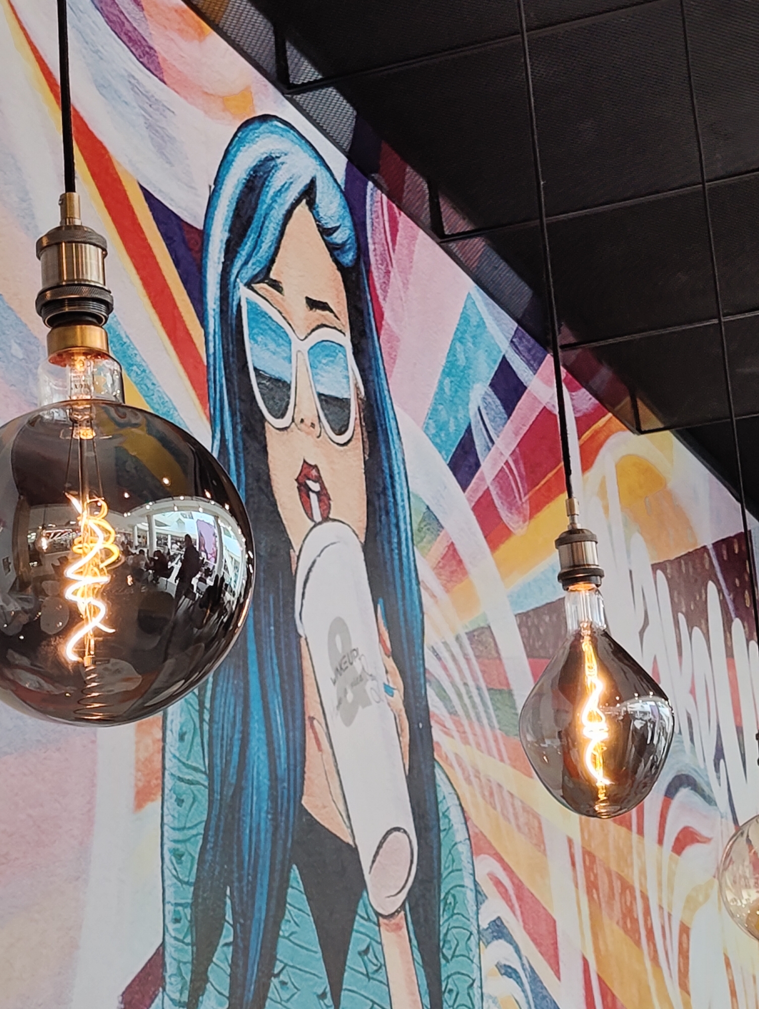 A low-angle indoor shot shows two suspended, lit, antique-style light bulbs in the foreground. Behind the light bulbs is a colorful mural of a woman with blue hair and sunglasses, holding a cup. The mural uses a vibrant, pop-art style with rainbow-like stripes and geometric shapes. The light bulbs' filaments are visible and glowing. The location is Plovdiv, Bulgaria. The image is taken at a location which features the mentioned mural, most likely inside a cafe or public space. The light fixtures are suspended from a dark, possibly mesh or paneled, ceiling. The reflection in the lightbulb reveals multiple people sitting at tables.