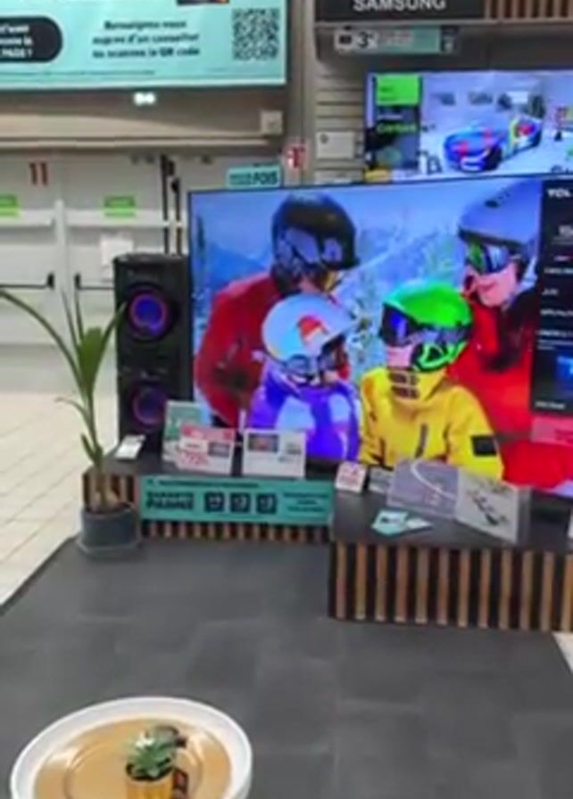 display of televisions for sale inside of a large store, with a TCL brand television as the main focus. The TCL television is displaying a series of videos. A sound system is on the left side of the display. A small table with a gold colored top is in the lower foreground with a small potted plant. Banners are hanging above the display, one that says "PAYEZ EN PLUSIEURS FOIS" (pay in several installments) with a QR code, and one advertising Samsung TVs. The floor of the store is dark grey. The environment is likely a large department store selling electronics.