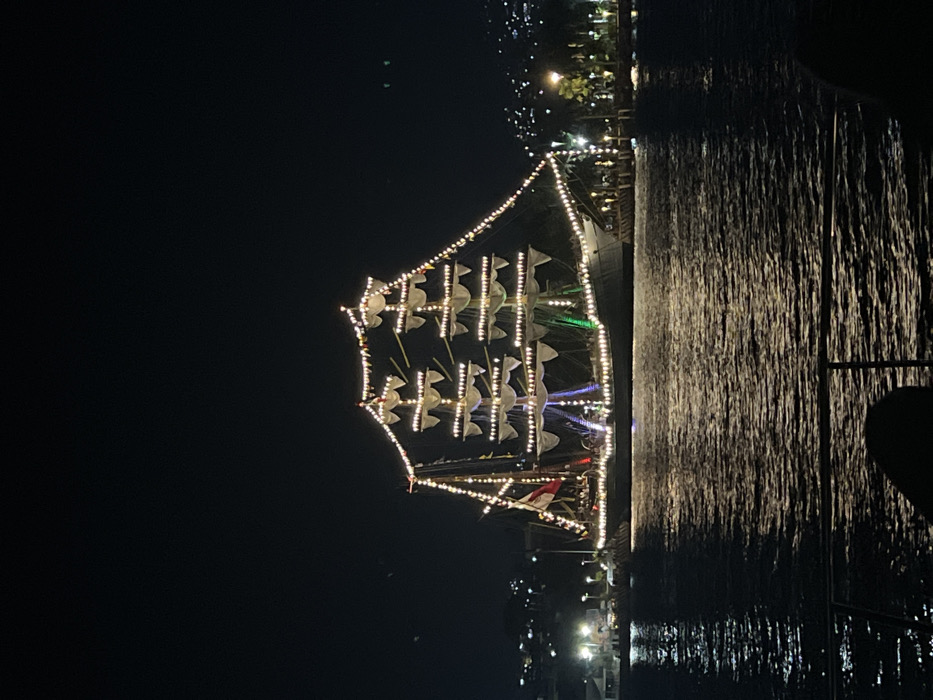 A night scene captures a ship adorned with lights, positioned near a body of water reflecting illumination. The vessel showcases sails arranged in a grid pattern, enhanced by numerous white lights strung along its rigging. The water surface mirrors the sparkling lights, while darker areas create contrast. Trees are faintly discernible in the background, adding depth to the scene.