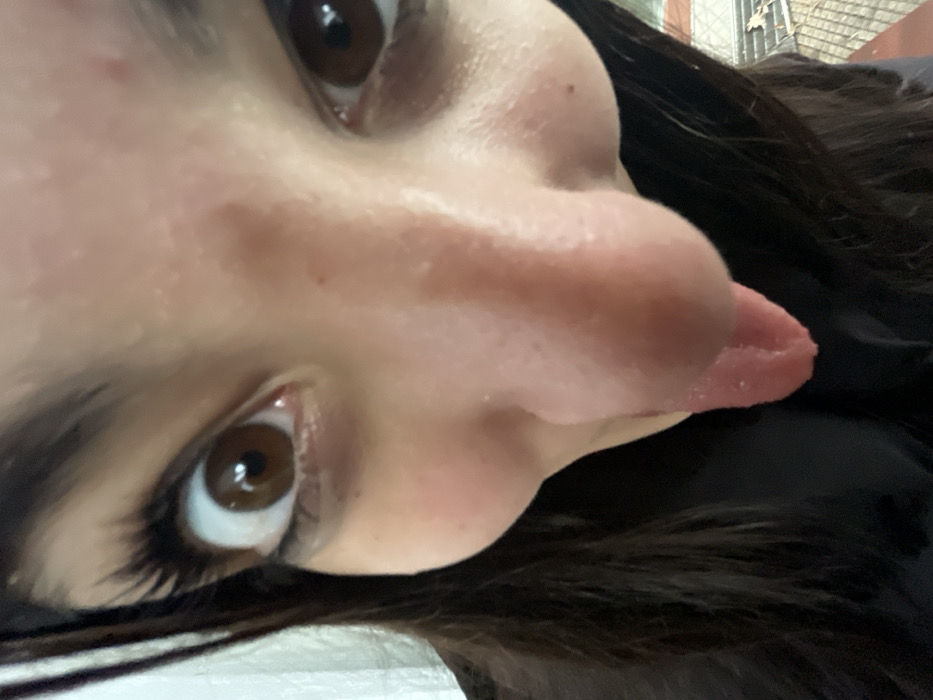 An extreme close-up, low-angle photograph depicts the face of an individual, characterized by significant wide-angle lens distortion. The subject presents widely opened dark brown eyes with visible dark eyelashes. The skin around the nose and forehead exhibits minor dermal irregularities. The mouth is open, with a pink tongue protruding downwards. Long, dark hair frames the face on both sides, and a dark-colored garment covers the lower neck and upper chest area. The background is out of focus, featuring an indistinct vertical light-colored plane on the left and a blurry, textured surface on the right. The scene is situated in Schiltigheim, France.