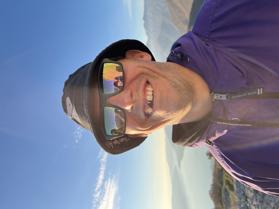 A man with a bucket hat and sunglasses smiles broadly. He wears a purple jacket with the "Charles River" logo. The sunglasses reflect a building and a person. A backdrop of mountains and a clear, light blue sky suggests an outdoor setting, possibly at a high altitude or scenic overlook. The photo's perspective is angled, adding a dynamic feel.