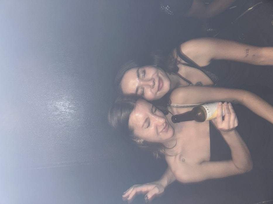 Two women are posing together, one holding a beer bottle. Both are smiling. The woman in the foreground has bare shoulders and a small heart tattoo on her chest. The other woman, behind her, is wearing a black top with spaghetti straps. The lighting is dim and there is a hazy effect in the image. The background appears to be a dark wall.