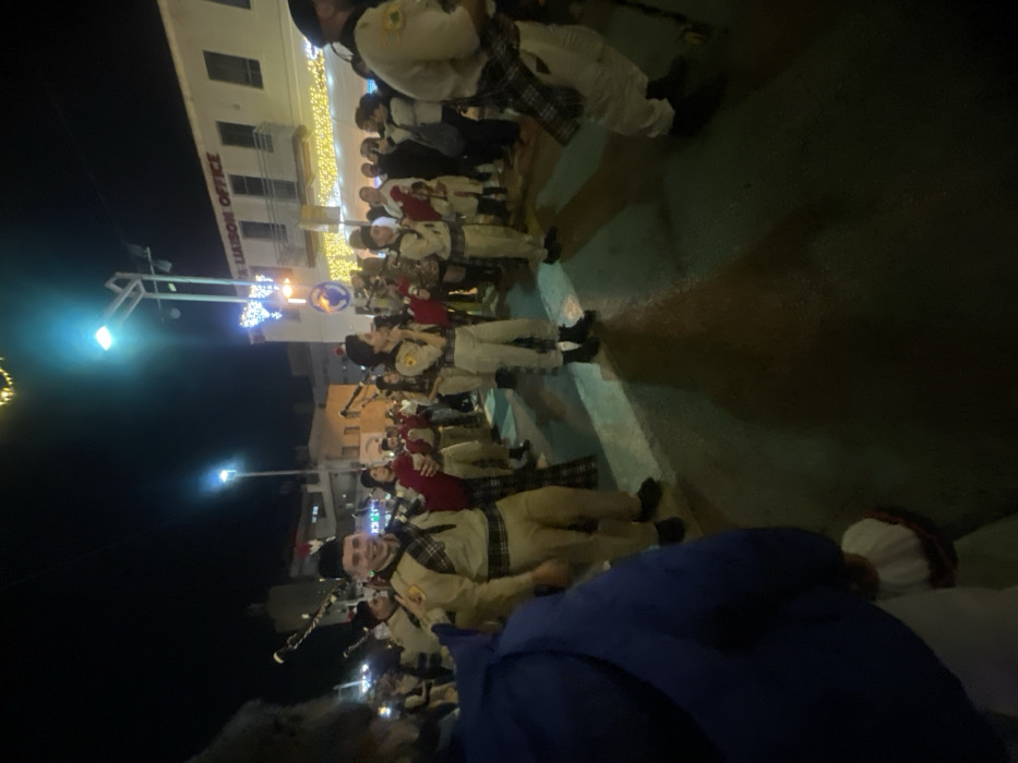 This nighttime image depicts a public street scene during a festive event, likely a parade or gathering, in the German Colony neighborhood of Haifa, Israel. The prominent white two-story building in the mid-ground on the right features the discernible red text "LIAISON OFFICE" on its facade, identifying it as the Baháʼí World Centre Liaison Office. The foreground is occupied by the back of an individual wearing a dark blue hooded jacket and light pants, holding a white object with red stripes. Ahead of this individual, a pipe band comprising numerous members is positioned on the street. Band members wear light tan or khaki-colored uniforms, dark hats (some with feathers), and plaid sashes or kilts. Many are equipped with bagpipes, some with red covers. A male band member, slightly left of center, is smiling directly towards the camera. To his right, a female band member is visible, also in uniform and holding a red-covered bagpipe. The street surface in the immediate foreground features a distinct teal-colored painted strip. In the background, numerous spectators are gathered on the right side of the street, observing the band. The scene is illuminated by multiple streetlights casting a greenish-white hue, and holiday string lights decorate the "LIAISON OFFICE" building and overhead, including a blue illuminated snowflake or star motif. Other buildings are visible in the darker background.