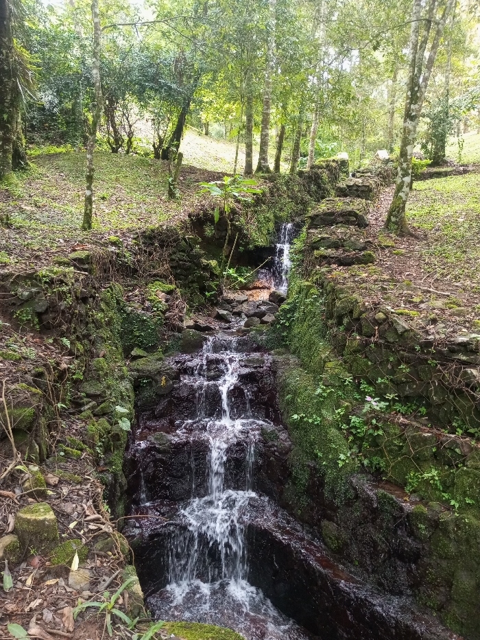 This image depicts a natural cascade waterfall situated within a lush, forested environment in Kanand, India. The central feature is a multi-tiered waterfall flowing downwards over dark, reddish-brown rock formations. The water appears white and frothy as it tumbles over the uneven rock surfaces. The waterfall is contained within a channel defined by moss-covered rocks and earth. The right bank of the channel consists of a structured wall of stacked, moss-laden stones, while the left bank is a more natural slope of rocks and soil. Surrounding the cascade are numerous tall trees with light-colored bark and dense green canopies, indicating a shaded environment. The ground in the foreground and along the banks is covered with scattered dry leaves, dirt, and patches of green moss and small plants. No human figures, animals, or artificial objects are visible in the scene.