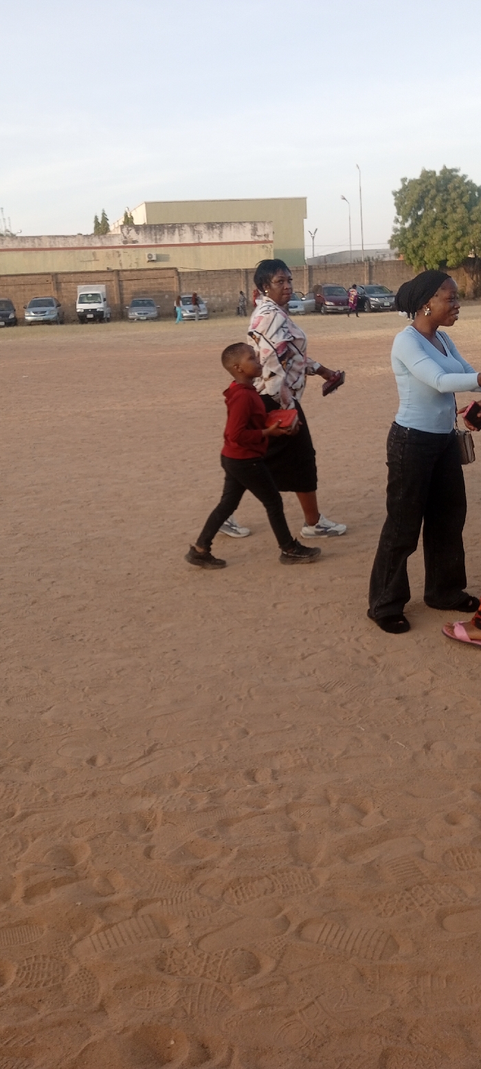 A group of three people walk across a dirt field. A young boy wearing a red shirt and black pants carries a small object. An older woman in a patterned shirt and black skirt walks beside him. To their right, a woman in a light blue shirt and black pants walks toward the viewer. In the background, a low building and parked cars are visible under a cloudy sky. The ground is covered in footprints.