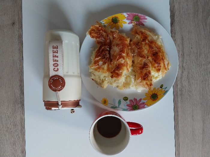 This overhead image presents a breakfast scene arranged on a two-toned surface, featuring a light-colored central area bordered by wooden texture at the top and bottom. The setting is in the city of Stamboliyski, Bulgaria. A white ceramic plate, adorned with a floral rim design in yellow, pink, and green, holds three pieces of a golden-brown, layered pastry, consistent with Banitsa, showing white cheese filling. To the left of the plate, a red ceramic mug with a white interior contains a dark liquid. Above the plate, a cream-colored cylindrical container with a brown base and top features a light brown fabric strap with "COFFEE" printed in brown letters. A small, round brown tag with "I WISH YOU" inscribed circularly is attached to the strap. Ambient lighting illuminates the scene, casting subtle shadows.