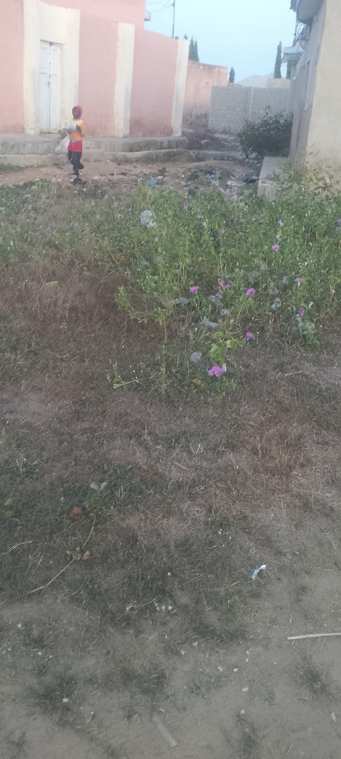 An outdoor scene shows a child walking near buildings, with a grassy area in the foreground. The grass is a mix of green and brown, with some purple flowers visible. Trash is scattered near the buildings and the grassy area. The buildings are painted in light colors. The sky is overcast, giving the scene a subdued feel.