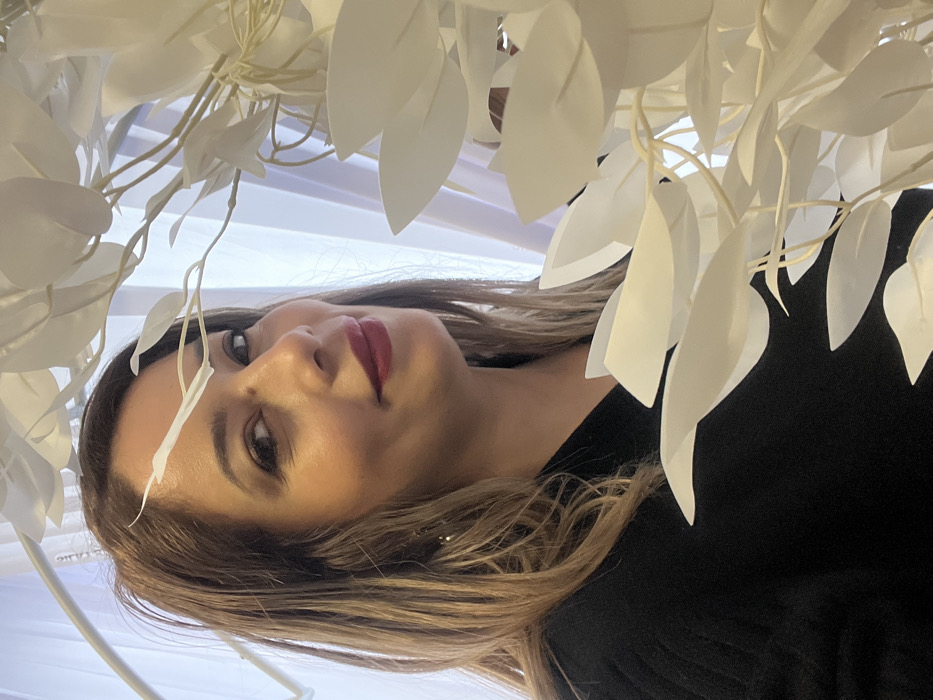An adult female, with shoulder-length light brown hair featuring blonde highlights and dark red lipstick, is depicted from the upper chest upward, looking directly at the camera with a slight smile. She wears a black v-neck top. White artificial foliage, composed of numerous leaves on slender branches, partially obscures the lower right and upper left portions of her face and the image foreground. Behind her, a diffused white background includes white fabric drapes and a curved white structural element on the left side. The scene is located in Mondeville, France.