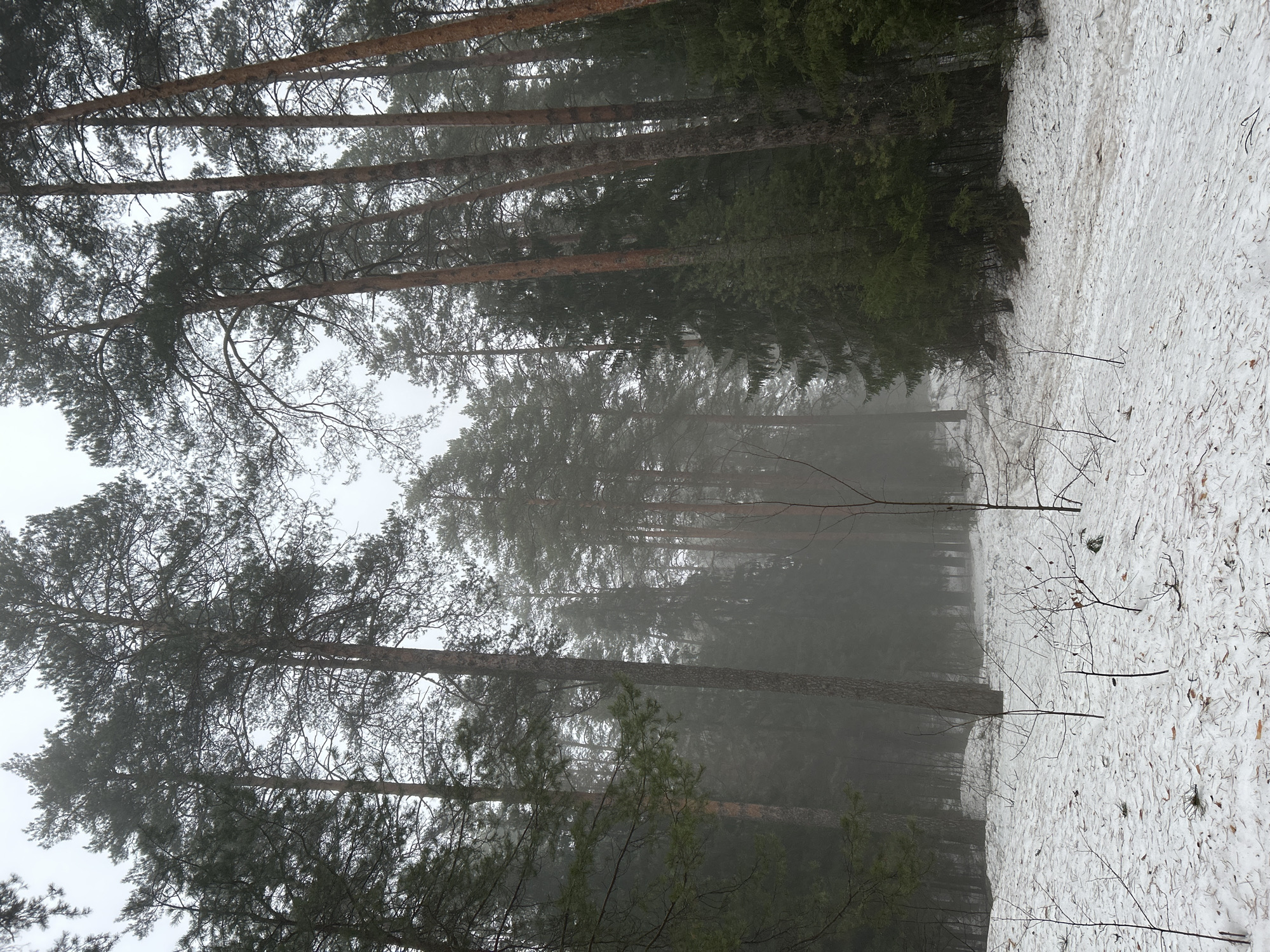 The image captures a winter scene in what appears to be a forest or wooded area, possibly located in or near Chaikovsky, Russia. The trees are tall and slender, with a mix of pine and other species. The ground is covered in snow, with patches of exposed ground. The sky is overcast, and there is fog obscuring the background. The scene appears deserted, with no people or animals visible. The focus of the image is on the natural environment, with the trees and snow creating a stark and cold atmosphere.